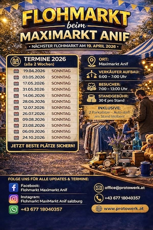 Flohmarkt beim Maximarkt in Anif jeden 2. Sonntag! Komm vorbei und stöbere durch tolle Schnäppchen, Raritäten und Alltagsgegenstände. Von Kleidung über Haushaltsartikel bis hin zu echten Fundstücken hier ist für jeden etwas dabei! Ort: Maximarkt Parkplatz, Anif (Salzburg) Aufbau ab: 6:00 Uhr ...