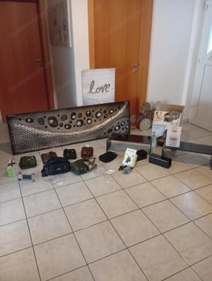 1 großes Metallhammerschlagbild, schwere Ausführung (180 x 60 cm). 1 Metallbild (90cm). 1 3d Bild. 13 neue Taschen für Damen und Herren.1 Eierkocher. 1 Heißluftfritteuse. 2 Motorrad-Fahrradhandyhalterungen. 2 Glas (dicke Ausführung) TV Computererhöhung (60 cm 20 cm hoch)2 Metallerhöhungen für TV etc ...