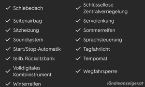 Ausstattung DAB-Radio, Radio, Lederlenkrad, ESP, Winterreifen, Isofix, Kopfairbag, Musikstreaming integriert, Elektrische Seitenspiegel, Apple CarPlay, CD, Abstandstempomat, ABS, Sportsitze, W-Lan Wifi Hotspot, Berganfahrassistent, Volldigitales Kombiinstrument, Sprachsteuerung, LED-Tagfahrlicht, Freisprecheinrichtung, ...