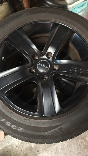 Verkaufe 4 Sommerreifen auf schwarzen Alufelgen, alle Reifen haben noch 6mm Profil, Reifen Herstellungsdatum (DOT) 4623, Felgenbezeichnung: Radius R12 8j x 18 H2 Einpresstiefe 45, Lochkreis 5x127 mm, das Zentrierloch hat 71,6 mm, die Felgen haben keine Beschädigungen, die Felgen passen zB auf einen Grand ...