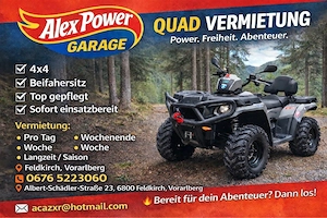 ALEX POWER GARAGE ATV MIETEN GALEXPOWERGARAGE500 Scanne & buche direkt über: VERMIETUNG: Pro Tag Wochenende Woche Langzeit Saison Albert-Schädler-Strä e 23 6800 Feldkirch, Vorarlberg BEREIT FÜR DAS ABENTEUER? DANN LOS!