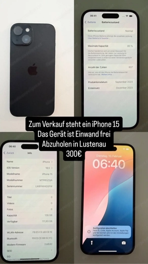Verkaufe mein iPhone 15 Pro (128 GB) in Blau. Erstnutzung August 2024. Technisch einwandfrei, sehr gepflegter Zustand. Display und Rückseite sehr gut erhalten, minimale übliche Gebrauchsspuren am Rahmen. Batteriezustand 88 % (482 Ladezyklen), mit Ladekabel. Kein iCloud-Lock, wird vollständig zurückgesetzt ...