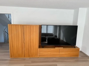 Tischler-Wohnwand aus Rüsterholz (Ulme) inklusive 75" LG Smart-TV zu verkaufen. Maße: Länge: 312 cm Tiefe: 47 cm