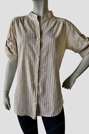 Wunderschöne, modische Bluse aus feinem, leichtem Baumwoll-Webstoff perfekt für Frühling, Sommer oder als luftige Übergangsbluse! Details: - Größe: 40 - Farbe: Beige mit zarten Streifen - Material: 100% Baumwolle (angenehm leicht & atmungsaktiv) - Knopfleiste vorne - Locker fallender, ...
