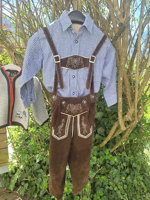 Lederhose, Hemd (Gr 98 104) 35,- und Wolljanker (Gr 98) 18,- im Set 50.-