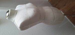 Schneiderpuppen-Torso zum Selbstnähen, Anpassen, Entwerfen etc. Styroportorso auf verchromtem Ständer mit Dreifuß Torso mit Vlies überzogen, Klebebandstreifen zur Zonierung und Symmetrieabgleich Abmessungen: Höhe gesamt mit Stativ ca. 140cm Höhe Torsu bis Schulter 65cm Halsumfang 36cm Brustumfang 89cm Taillenumfang ...