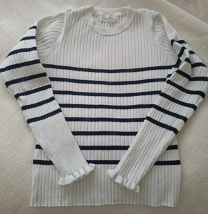 Hallo, ich verkaufe diesen Pullover in weiß mit dunkelblauen Streifen und Rüschen an den Ärmeln - wie neu.