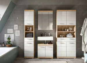 Neues und unbenutztes Badezimmerset bestehend aus Spiegel, Unterschrank, Hochschrank und breiter Schrank, bereits aufgebaut. Maße siehe zweites Bild. Passt leider farblich nicht. Neupreis 650