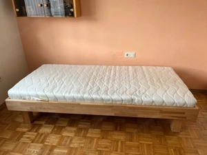 Massives Bett (Buche) inklusive Lattenrost, Matratze und Nachtkästchen