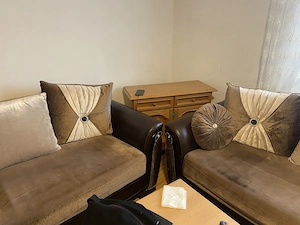Drei Sofas, zwei mal groß, einmal klein Drei Teppiche Ein großes Bett mit den Matratzen Ein weiße Schrank mit einem mittleren Spiegel Ein Esstisch und zwei Stühle, Holz. Commode Holz groß mit drei Türen, Schubladen Commode Holz klein, zwei Türe zwei Schubladen