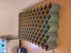 Ganz tolles Bett aus Karton. Türkis Farbe. Verstellbar. Einfach umzuziehen.