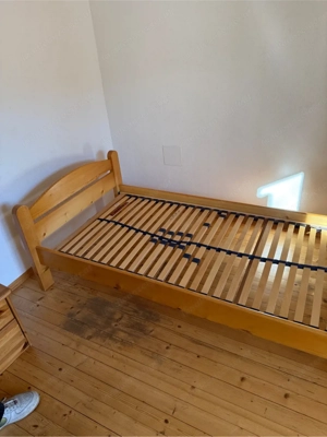 Bett 200 x 140, Vollholz mit oder auch ohne Matratze (Überzug waschbar) und Lattenrost Guter Zustand, nur einige der Schrauben sind etwas vermurkst und müssen ev. ersetzt werden Wir haben es als Gästebett verwendet.