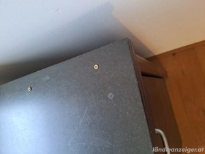 Ursprünglich sehr stabiler Schreibtisch Arbeitstisch, inzwischen selbst verschraubt, bestehend aus dicker, stabiler Tischplatte mit zwei durchgängigen Seitenteilen, aus sehr harten, schwarz durchgefärbten MDF Platten mit zwei Unterschränken mit je einer Schublade, die Platten könnten für Bastler interessant ...