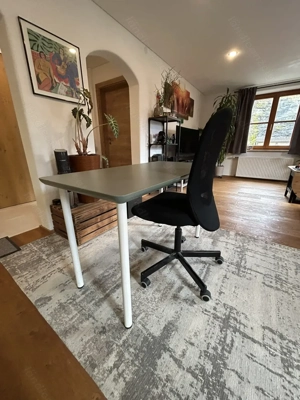 Verkaufe einen Schreibtisch (120x60x74 cm) mit weißem Metallfüßen, Tischplatte in hellgrau mit leichtem Grünstich und schwarzem Bürostuhl. Der Stuhl ist höhenverstellbar und hat einen abnehmbaren, waschbaren Stoffbezug am Rückenteil. Beides in gutem, gebrauchten Zustand mit leichten Gebrauchsspuren. Nur ...