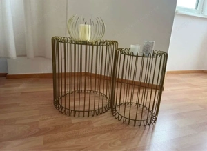 Hallo! Zum Verkauf steht ein stilvolles 2er-Set Couchtische Beistelltische in elegantem Goldton mit Glasplatte. Die Tische überzeugen durch ihr modernes, luftiges Design und passen perfekt in Wohn-, Schlaf- oder Loungebereiche. Durch die zwei unterschiedlichen Größen lassen sie sich flexibel einsetzen ...