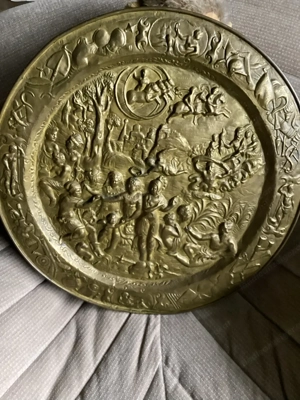 Der Teller zeigt eine klassische Mythologiesche Szeneim Stil der Antike Renaissance: Mehrere nacktFiguren,Putten, Tänzerinnen, Menschen beim Tanzen, Musizieren, Feiern, oben Reiterfiguren im Kreis, solche Teller wurden in späten 19 & und frühen 20 Jahrhunderten produziert , eine eingravierte Signatur ...