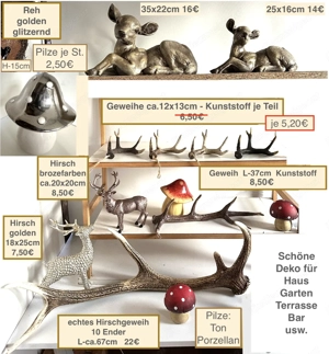 Wunderschöne Dekoration für Haus und Garten, auch für Weihnachten. Echtes Hirschgeweih 10 Ender. 1 Hirschgeweih Kunststoff grösser und ein paar Kleinere, Rehgehörn. Schöne Pilze, Fliegenpilz, je Stück. Hirsch Figur, 1x kupferfarben und 1x goldfarben. Bitte beachten sie alle Fotos Weitere schöne Dinge ...