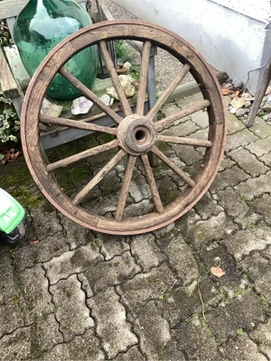 Altes originales Wagenrad aus Holz mit Eisenreifen und Metallnarbe- Vintage Deko mit schöner authentischer Patina ! DM 86 cm