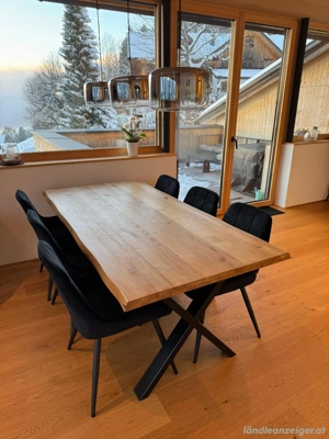 Esstisch Wildeiche Echtholz massiv geölt Markante Baumkante Zustand Wie neu Minimale Gebrauchsspuren Länge Breite Höhe: 180 90 75 cm X-förmige Tischbeine aus schwarz pulverbeschichtetem Stahl Platz für 6 Personen Selbstabholung