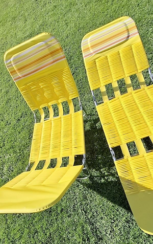 Vintage-Sonnenliege im Retro-Stil  "Spaghetti-Liege" mit charakteristische Bespannung aus den 70ern mit Kunststoffschläuchen NEU UNGENBRAUCHT in seltener Farbe! 57 x 182 x 27 cm Höhe Preis pro Stk. versicherter Versand möglich