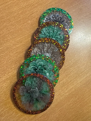 Haufgemachte Untersetzter aus Epoxidharz *jew.16 *für Heiß & Kltgetränke *abwaschbar *schnell verräumt *mit Halterung
