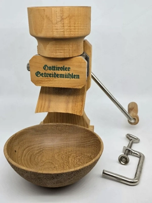 Diese Getreidequetsche ist so gut wie neu, da ganz selten benutzt. Es ist eine qualitativ sehr hochwertige Quetsche von der Firma "Osttiroler Getreidemühlen" alles in perfektem Zustand, inkl. gedrechselter Schale aus Eichenholz (auf Wunsch ist auch eine Schale aus Zirbenholz möglich)