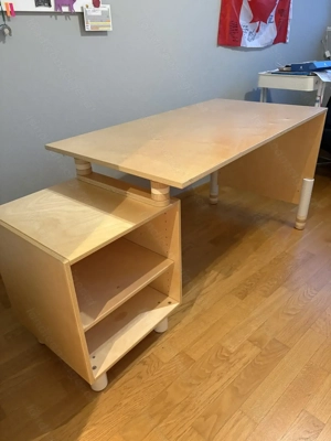 Kinderschreibtisach von JAKO-O aus Massivholz Multiplex Platte. Maße 120cm x 65cm Tischplatte, Höhe flexibel einstellbar. Maße 45cm x 45cm x 45cm Seitlicher Korpus mit EInlagefach. Höhe 70cm aber durch Einsatz von Einlegescheiben (siehe Bild) in der Höhe einstellbar.