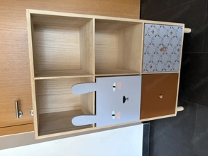 Wunderschönes Kinderregal der Marke Bloomingville Modell Kalle mit offenen Fächern und drei liebevoll gestalteten Schubladen mit Tiergesichtern Maße B 55cm, H 90cm, T 28cm