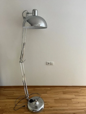 Verkaufe eine Stehlampe mit verstellbarem Arm und großem, halbrundem Metallschirm. Die Lampe hat ein modernes Industrial-Design und eignet sich ideal als Lese- oder Wohnzimmerlampe. Farbe: Silber Chrom Höhenverstellbarer, beweglicher Arm Großer, schwenkbarer Lampenschirm Stabiler Metallkorpus Zustand: Der ...