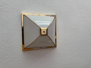 Deckenlampe aus Glas und Messing - Topzustand. Maße: B 34 cm x L 34 cm x H 16 cm.