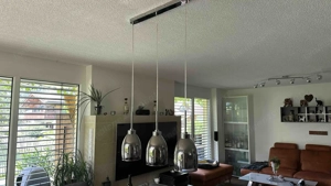 3-flammige Pendelleuchte, 1 Schirm gesprungen und geklebt. Ist keinem Besucher bisher aufgefallen, ist aber sichtbar. So verwendbar, oder mit neuen Schirmen auszustatten. Neupreis war 110 .
