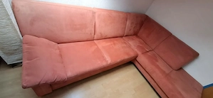 Verkaufe Eckgarnitur lachsfarben, Aus strapazierfähiger Stoff Abmaße ca. 2.4 x 2.0 m Ausklappbare Schlafmöglichkeit für eine Person Unterhalb können Polster und Bettdecke aufbewahrt werden Leichte Abnutzung
