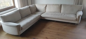 Hochwertige Marke, Polsterbezug Microfaser beige, der abziehbare Stoffbezug ist über die Jahre auf den Sitzflächen teilweise abgenützt, die Garnitur wurde immer gut gepflegt. L-Format Schenkelmaße Li. 270 cm, re. 240 cm
