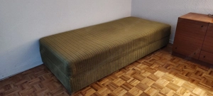 Aufgrund von Wohnungsauflösung geben wir dieses praktische und coole Vintage Bett her. Es bietet nützlichen Stauraum, da es aufklappbar ist. Der Stoff ist fürs Alter noch in ghörigem Zustand. Man kann auch gut darauf liegen, aber es gibt altersbedingt schon etwas nach. Nicht schlimm, aber trotzdem. Maße: Breite: ...