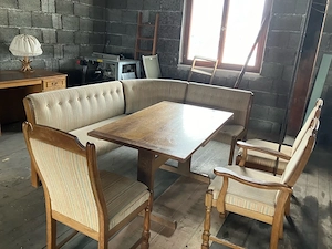 Wohnzimmereinrichtung mit Tisch, Eckbank, 3 Stühle, Couch ( alles gepolstert mit demselben Stoff) und Schreibtisch.
