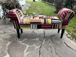 Kleines gepolstertes Sofa aus bunten Stoffelementen, Patchwork-Stil, in bestem Zustand, zu verkaufen. Füße sind aus Holz, schwarz lackiert. Maße: L x B x H 105 x 30 x 53 cm