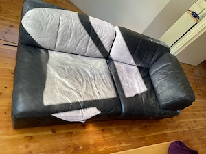 Verschenke big Sofa mit Kissen. Hat ein kleines Loch auf der linken sitzhälfte und das kunstleder blättert ab.