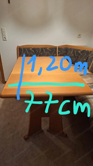 Verschenke Massivholz Eckbank aus den 70ern mit Tisch, zwei Stühlen und Tischdecken - gmt. 180x140cm