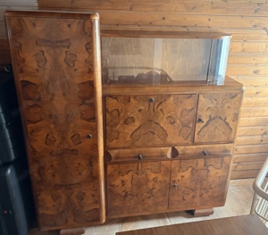 Wunderschöner, gut erhaltener Schrank. Edles Wurzelholz-Furnier mit schöner, außergewöhnlicher Maserung. Oben Vitrinenteil mit Glas, mittig Sekretärfunktion, rechts Barschrank, unten Stauraum. Der hohe linke Teil Stauraum, hier wurden selbst mal Regalböden ergänzt. Ideal als stilvolles Einzelstück ...