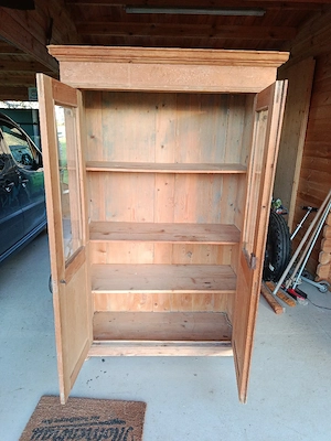 alter Schrank, Massivholz: Breite 97cm (Kranz oben107) x Tiefe 50cm x Höhe 185,5cm. Nutzbare Tiefe innen: 44,5cm Türoffnung 72,5cm breit. Das Massivholz ist innen natur=roh, aussen hat es einen Anstrich mit Farbe ( in Optik "Holzmaserung"), also KEIN Furnier oder so...., Farbe =entfernbar, sieht dann ...