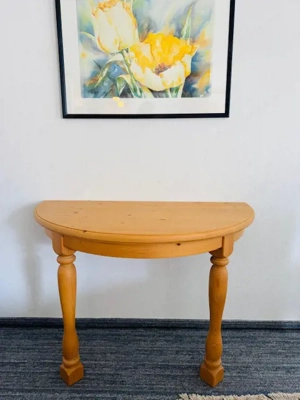 Wunderschöner Wandtisch aus massivem Fichtenholz, mit gedrechselten Füssen. Maße: B 110 cm x T 57 cm x H 77 cm.