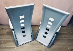 Sehr guter Zustand 2 weisse moderne Stühle, Kunstlederoptik H: ca 100cm Sitzfläche ca 40x40cm Versandkosten nicht inklusive