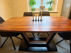 Massivholz-Esstisch Akazie (Bootsform) Industrial Look Verkaufe einen hochwertigen, massiven Esstisch mit wunderschöner, natürlicher Maserung. Ein echtes Unikat für jedes Esszimmer. Platte: Echtes Akazienholz, vollmassiv und lackiert (sehr pflegeleicht). Design: Edle Bootsform mit sanft geschwungenen ...