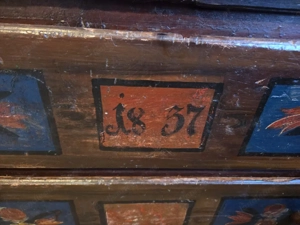 Schöne alte Bauernkommode aus Massivholz mit handbemalter Front und floralen Motiven. In der Mitte ist die Jahreszahl 18 57 aufgemalt, was auf das Herstellungsjahr hinweist. Die Kommode hat 3 große Schubladen mit gedrechselten Holzknäufen. Die Bemalung ist typisch für traditionelle bäuerliche Möbel ...