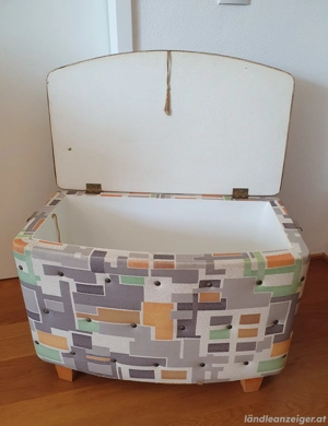Rahmen und Füße aus Holz, Seiten mit Kunststoff überzogen und genietet. Deckel außen mit Stoff überzogen. Messinggriffe an den Seiten. Maße: 63 35x40 cm. Trägt Gebrauchsspuren.