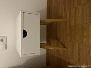 Zwei Nachtkästchen in weiß mit Holzfüßen und jeweils einer Schublade, Gesamthöhe 45, Breite 34, Tiefe 34