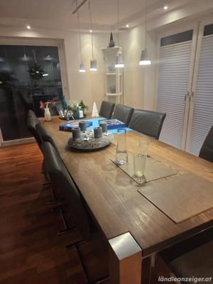 Verkauft wird ein Esszimmertisch in Tischlerqualität Massivholzplatte in Wildnussbaum Lasur Gestell mit 4 Tischbeinen in Edelstahl-Ausführung (Neupreis: Euro 3.800,-) Maße: 300 x 100 x 77,5 cm 10 Esszimmersessel in Leder, dunkelbraun Maße: 48 cm breit x 54 cm tief x 100 cm hoch