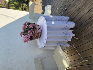 2 Tische mit je 6 Stühlen gegen Selbstabholung zu verschenken. Tischmaß 90cm x 180cm. Vollholz Sessel Sitzhöhe 44 cm Lehne hinten 95cm Vollholz Fichte?