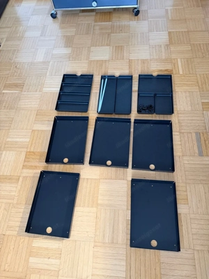 Original USM Haller Zubehör-Set bestehend aus mehreren Metall-Schubladeneinsätzen Organisationsfächern sowie 2 original USM Winkeln für Türen (Chrom). Ideal zur Ergänzung, Erweiterung oder als Ersatzteile für bestehende USM-Haller-Module. 1 Metall-Schubladeneinsätze Original USM Haller, gebraucht, ...