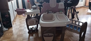 selten gebraucht, gut erhalten, Puppenbett mit Mobile, Badewanne mit Duschkopf, Sitz zum Essen, Bilderrahmen, Zubehörkleinteile, Puppen. Maße zusammen geschoben: B-67cm, T- 64cm, H- 70cm Griff und 2 Räder NP: 120